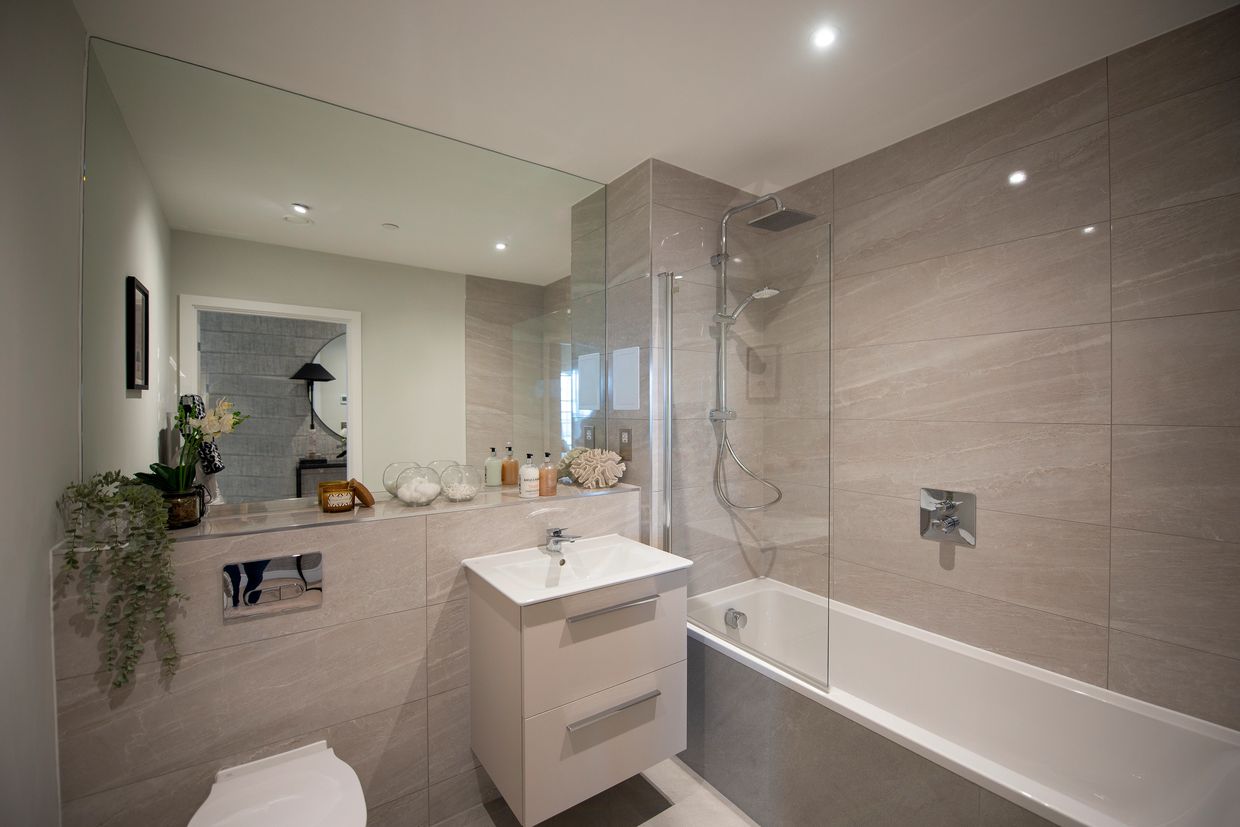 • Contemporary style bath with tiled bath panel and toughened glass shower screen to bathrooms
